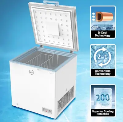 The Godrej DH EPenta 225D 1HCN RW is a 207 L manual deep freezer in White, designed for reliable frozen storage with manual defrost, sturdy construction, and ample space — perfect for homes, shops, or small businesses needing dependable cold preservation.