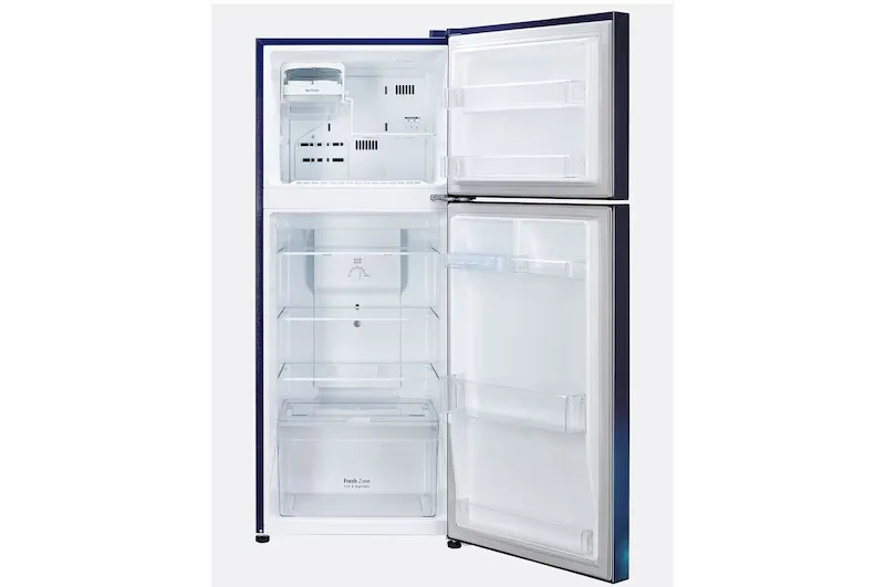 The refrigerator’s elegant Blue Charm PET door finish and modern pocket handle add aesthetic appeal to any kitchen. Inside, it includes three tempered glass shelves for strong and stable storage, along with two full and two half transparent door baskets for bottles and condiments. The bright top LED light enhances visibility, and the spacious vegetable box keeps produce fresh and organized.