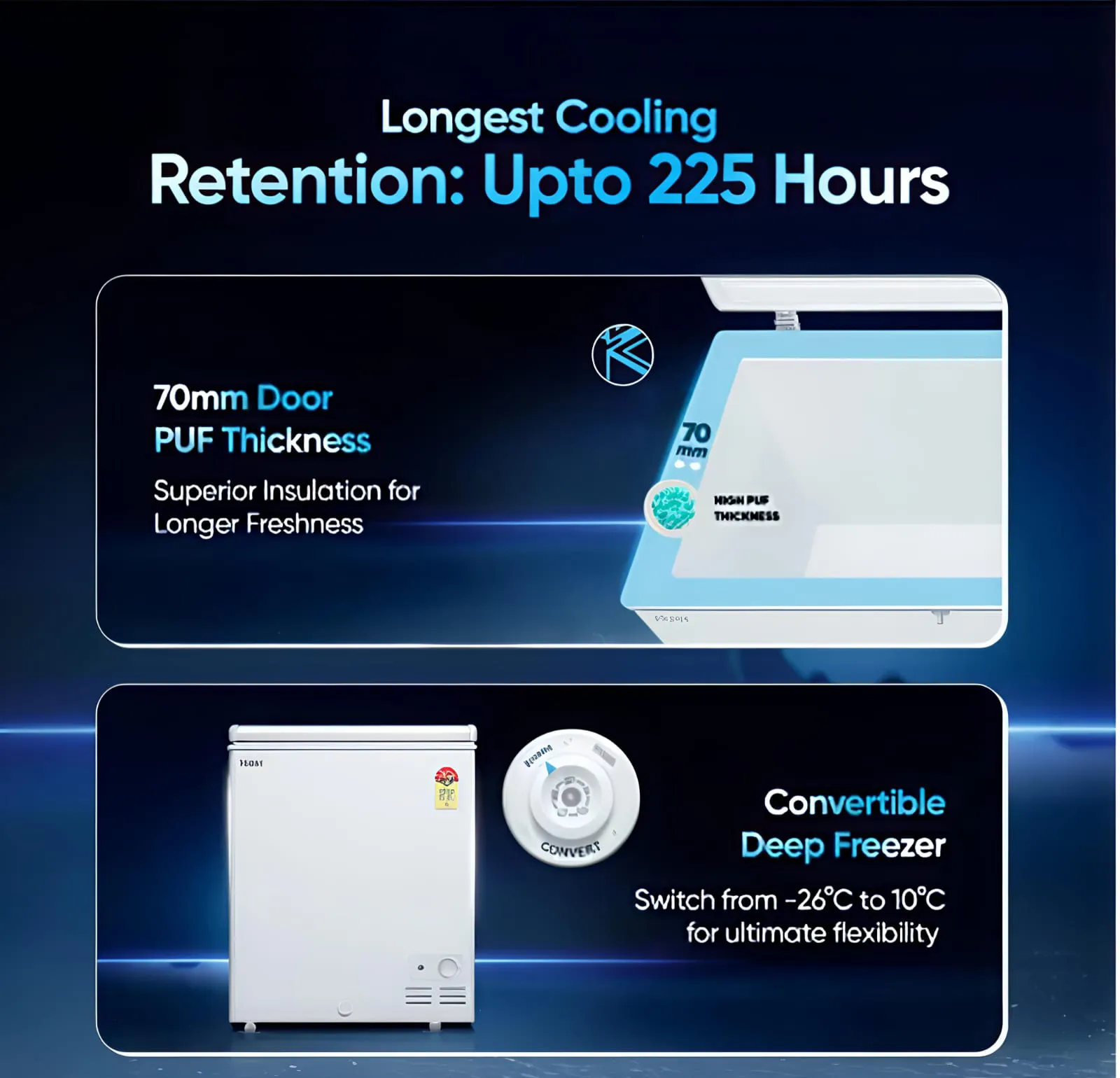 Experience superior cooling and energy savings with the Haier 230 Litres 5-Star Hard Top Freezer. Designed for performance and durability, it features a hard top door finish, embossed PCM inner liner, and static cooling for consistent temperature maintenance. The freezer operates efficiently within a temperature range of +10°C to -26°C, making it perfect for storing frozen foods, dairy, and beverages.