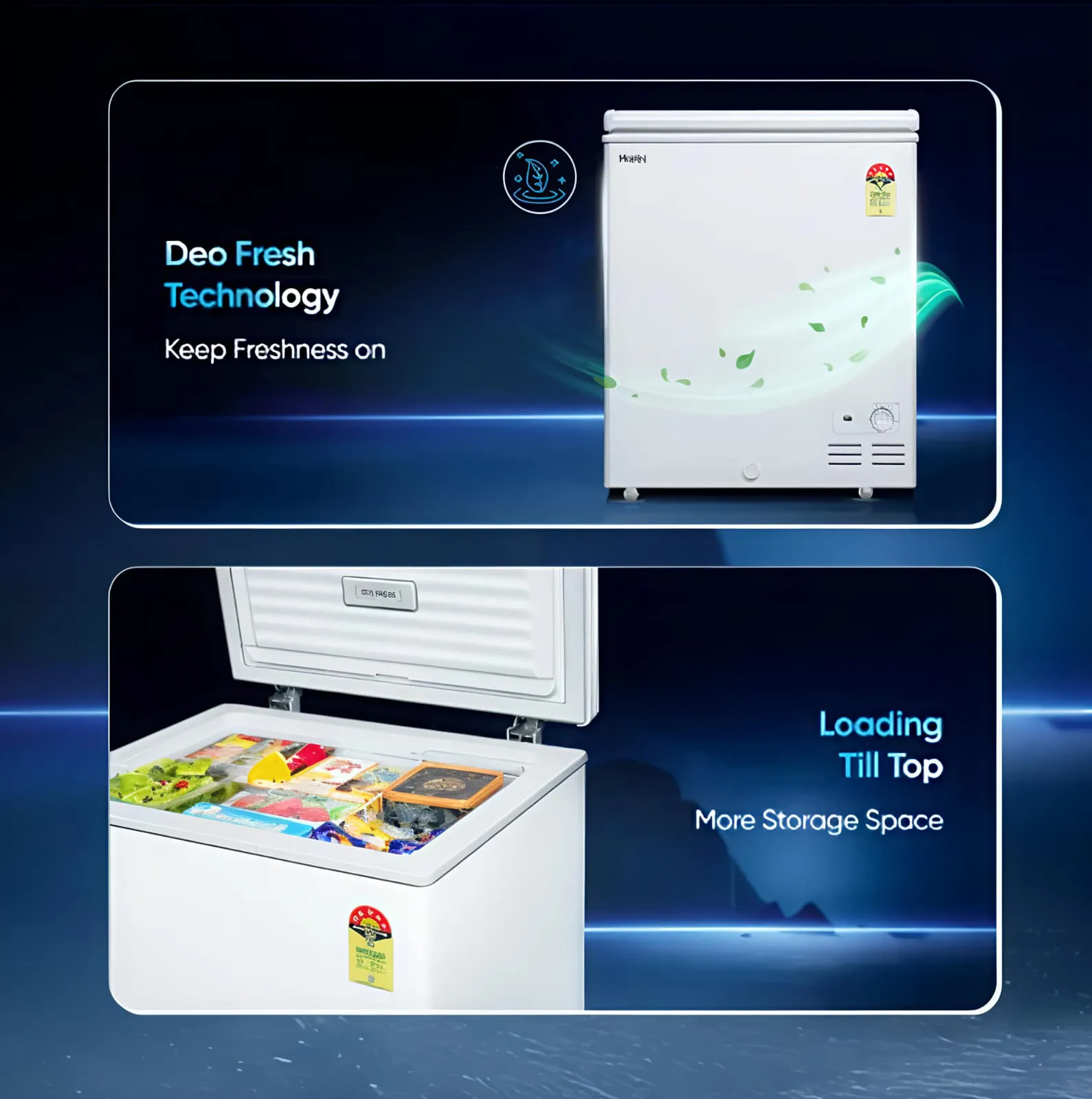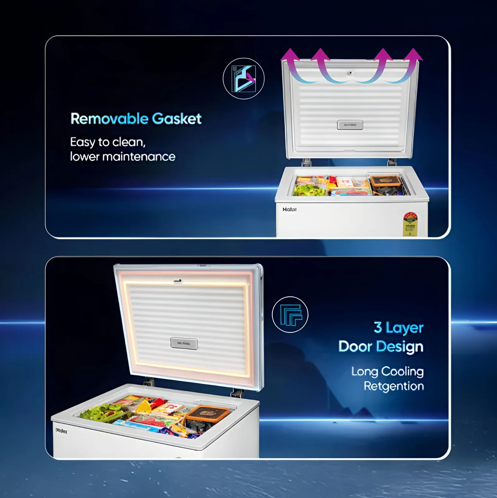 Haier 290L Hard Top Deep Freezer delivers powerful cooling with low energy consumption. Designed with a durable hard top lid, embossed PCM inner liner, and wide temperature range, it ensures long-lasting freshness and efficient freezing performance.