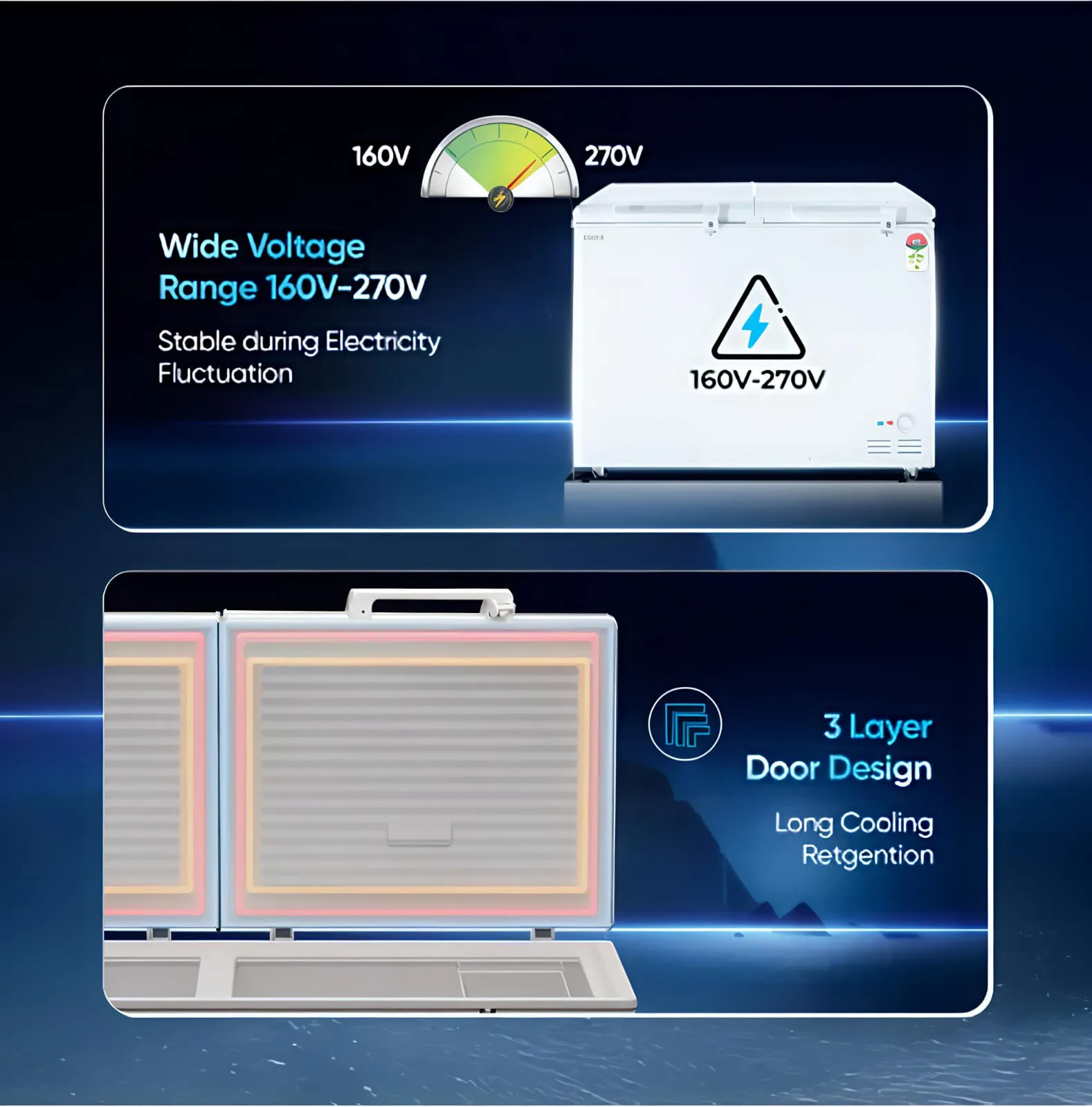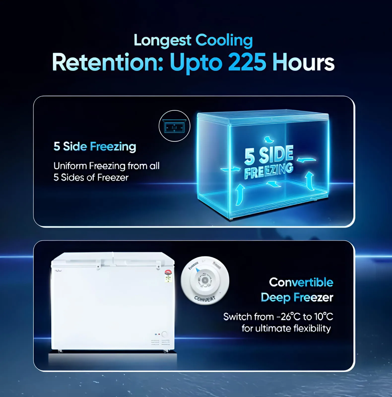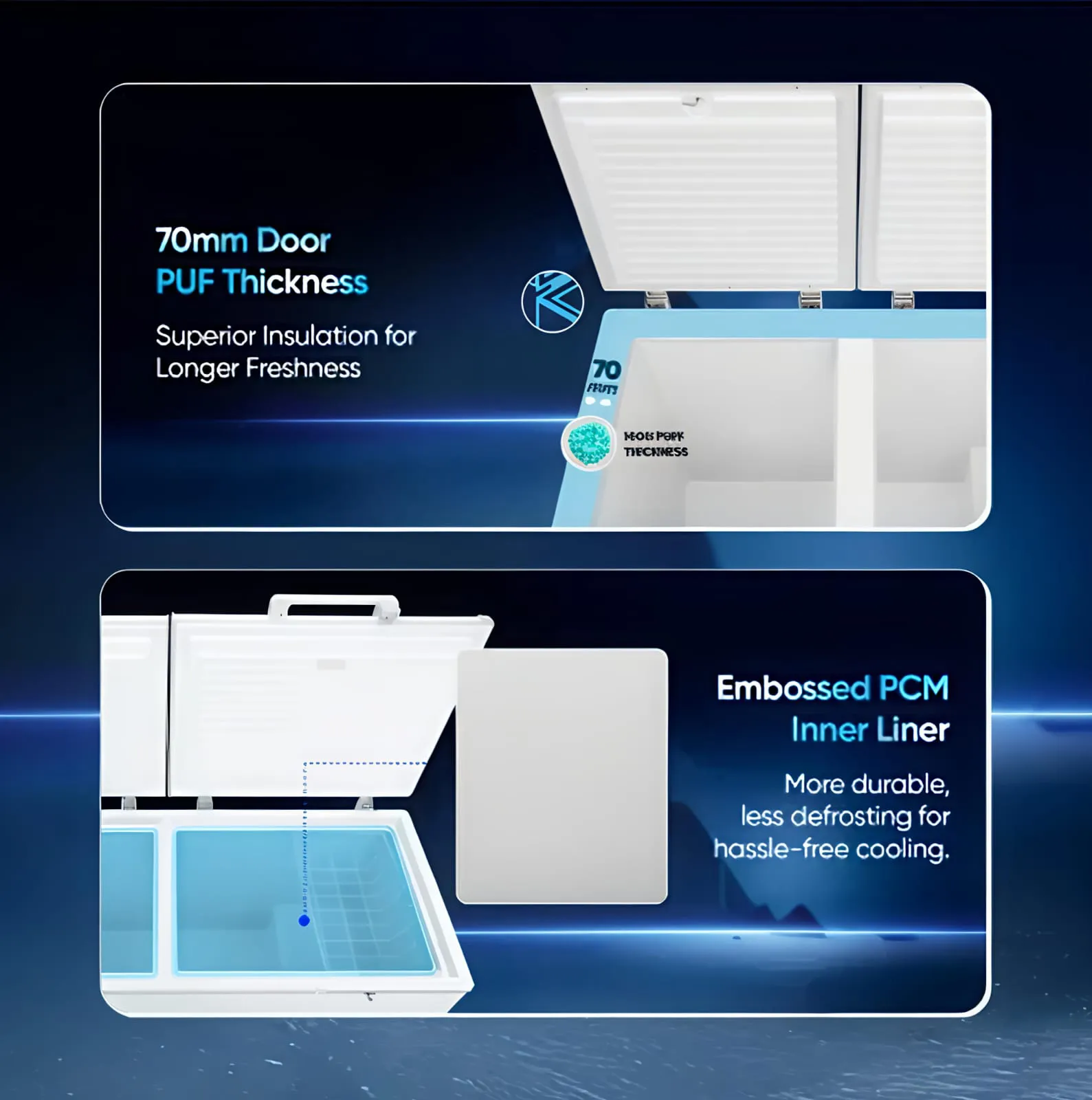 The dual condenser system enhances cooling efficiency and reliability, while the embossed PCM inner liner ensures better hygiene and faster cooling retention. With a wide temperature range from +10°C to -26°C, it’s ideal for both freezing and chilling requirements.