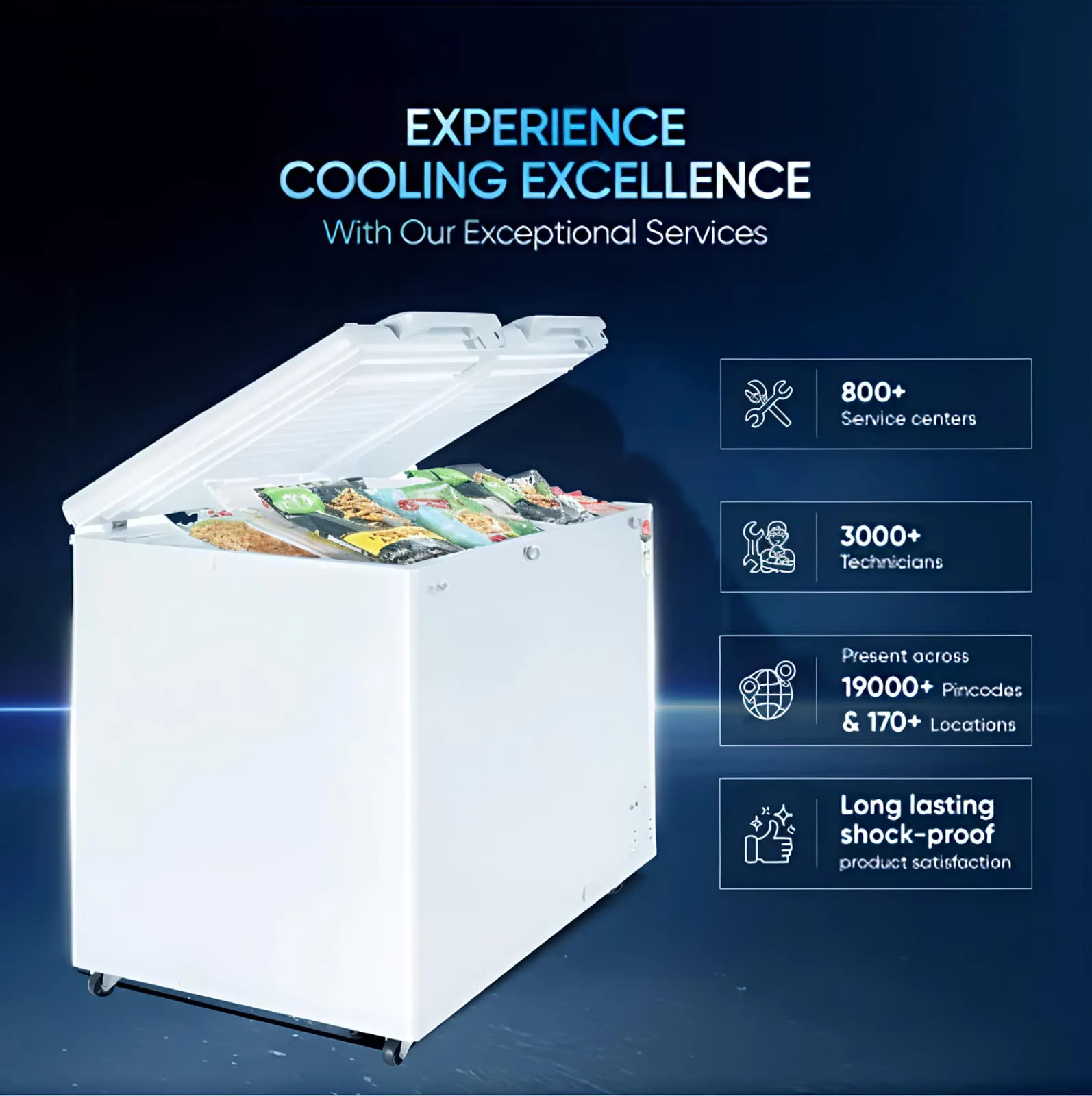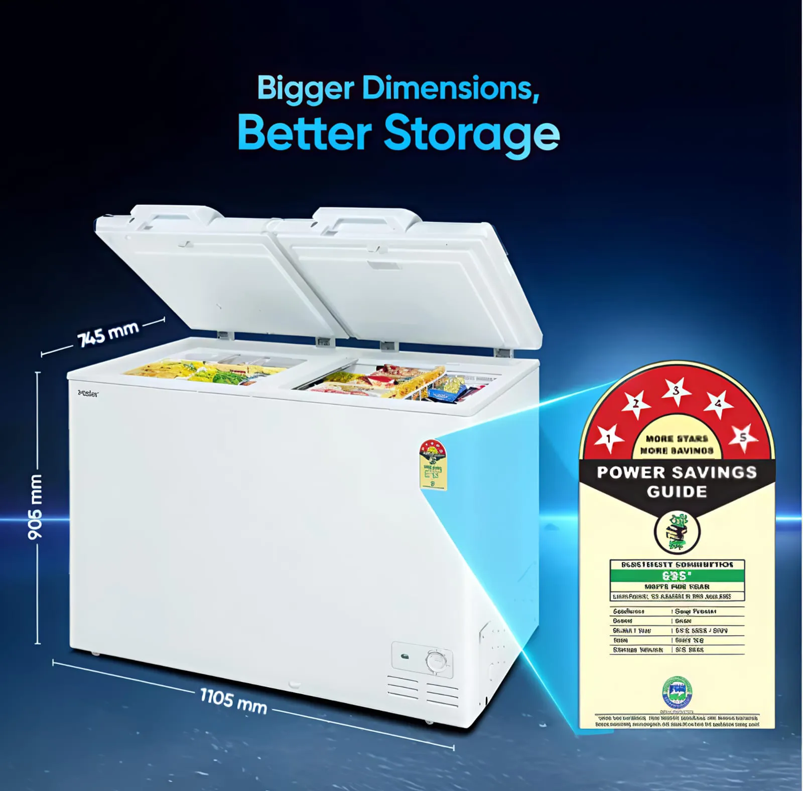 The Haier 350L 5-Star Hard Top Freezer offers powerful cooling, low energy consumption, and long-lasting performance. Designed with dual condensers, an embossed PCM inner liner, and a wide temperature range of +10°C to -26°C, it’s perfect for both freezing and storage needs.