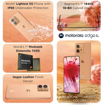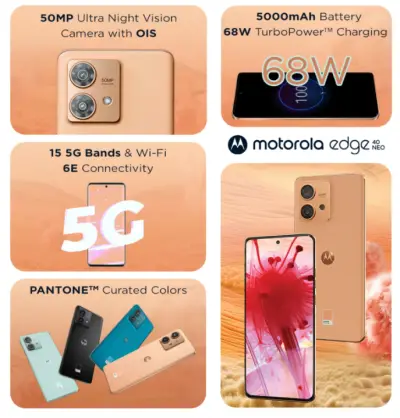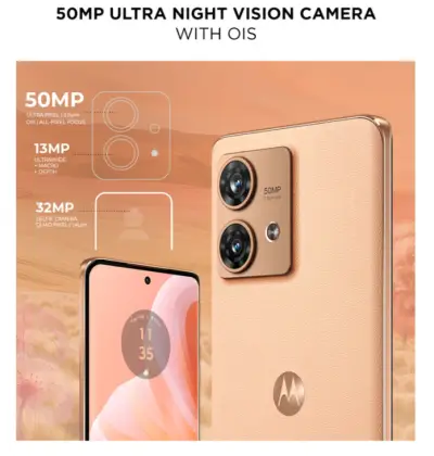 Powered by a MediaTek Dimensity 7030 5G processor paired with 8 GB of RAM and 128 GB of storage, the phone handles daily tasks, multitasking, and casual gaming with ease. The rear camera setup includes a 50 MP primary sensor with Optical Image Stabilisation (OIS) for sharper photos and a 13 MP ultra-wide lens for wider shots, while a 32 MP front camera captures detailed selfies. A 5000 mAh battery provides excellent all-day battery life with support for 68 W fast charging to quickly recharge when needed. With a clean Android experience, water and dust resistance (IP68), in-display fingerprint security, and stereo sound enhancements, the Edge 40 Neo stands out as a complete package in its segment.