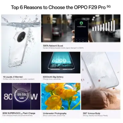 Photography is handled by a dual rear camera system led by a 50 MP main sensor with optical image stabilization (OIS) and a 2 MP auxiliary sensor, while a 16 MP front camera captures clear selfies and video calls. A massive 6000 mAh battery with 80 W SUPERVOOC fast charging delivers long battery life and quick top-ups. The device is also built ruggedly with IP69 water and dust resistance and a 360° armour body that enhances durability. With modern connectivity, immersive sound, and ColorOS 15 based on Android 15, the OPPO F29 Pro 5G is crafted to be a dependable daily driver.