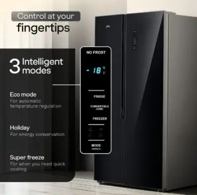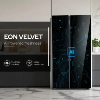 The Godrej RS EON VELVET 646C RIT is a 600 L Frost Free Side-by-Side refrigerator in sleek Opera Black with a 3-Star energy rating, inverter compressor, and smart convertible zones powered by AI — ideal for large families seeking spacious and customizable cooling performance.