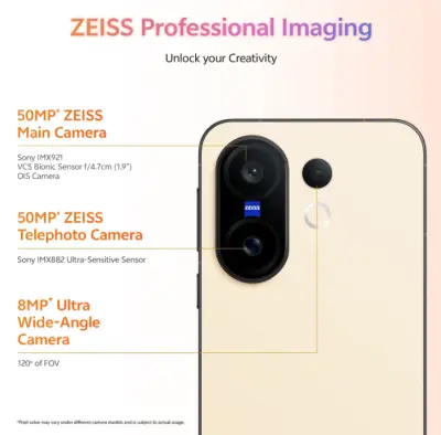 Under the hood, a flagship-class 5G-ready MediaTek Dimensity chipset paired with 12 GB of RAM delivers fast, responsive performance for multitasking, demanding apps, and high-end gaming. The triple camera system, co-engineered with ZEISS optics, includes a 50 MP main sensor with optical image stabilization (OIS) for sharp and detailed photos, a 50 MP periscope telephoto lens for impressive zoom shots, and an 8 MP ultra-wide lens for wider landscapes and group shots. A high-resolution 50 MP front camera captures detailed selfies and quality video calls.