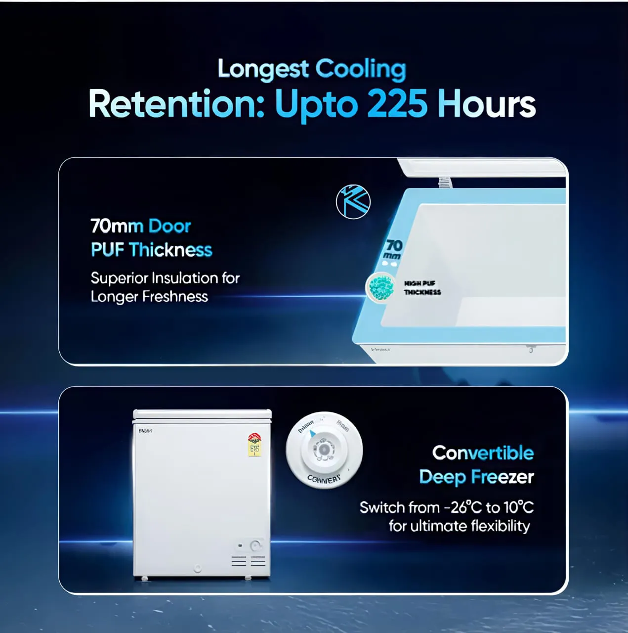 Built with a hard top design and embossed PCM inner liner, this freezer provides superior insulation and durability. Its wide temperature range of +10°C to -26°C makes it suitable for use as both a refrigerator and freezer. The R600a refrigerant ensures eco-friendly and efficient cooling