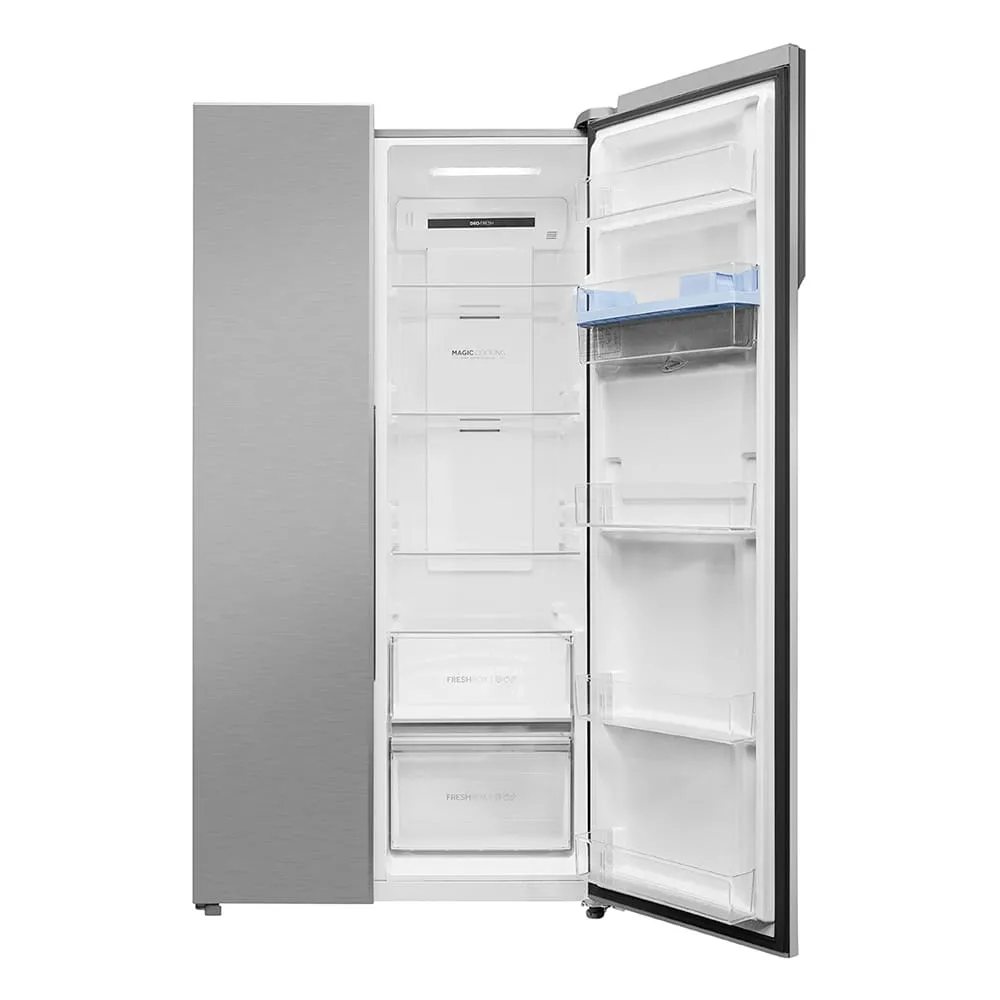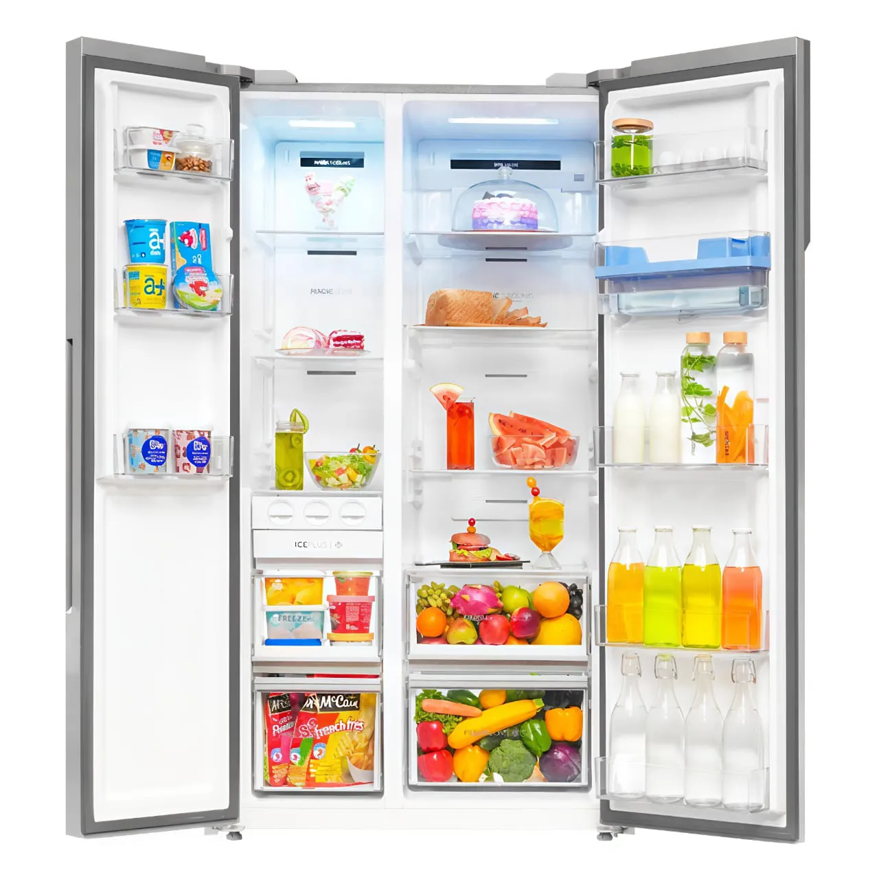 Upgrade your kitchen with this 596L Side by Side Frost Free Refrigerator featuring advanced Magic Cooling technology and an energy-efficient inverter compressor. Designed with a sleek steel finish, toughened glass shelves, and bright LED lighting, it ensures style and performance for modern households.