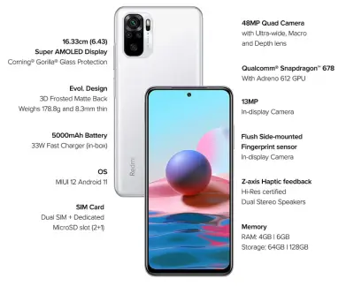 The Redmi Note 10 White offers a premium design and strong mid-range performance. It is powered by the Qualcomm Snapdragon 678 octa-core processor, ensuring smooth multitasking, efficient performance, and stable gaming capability.